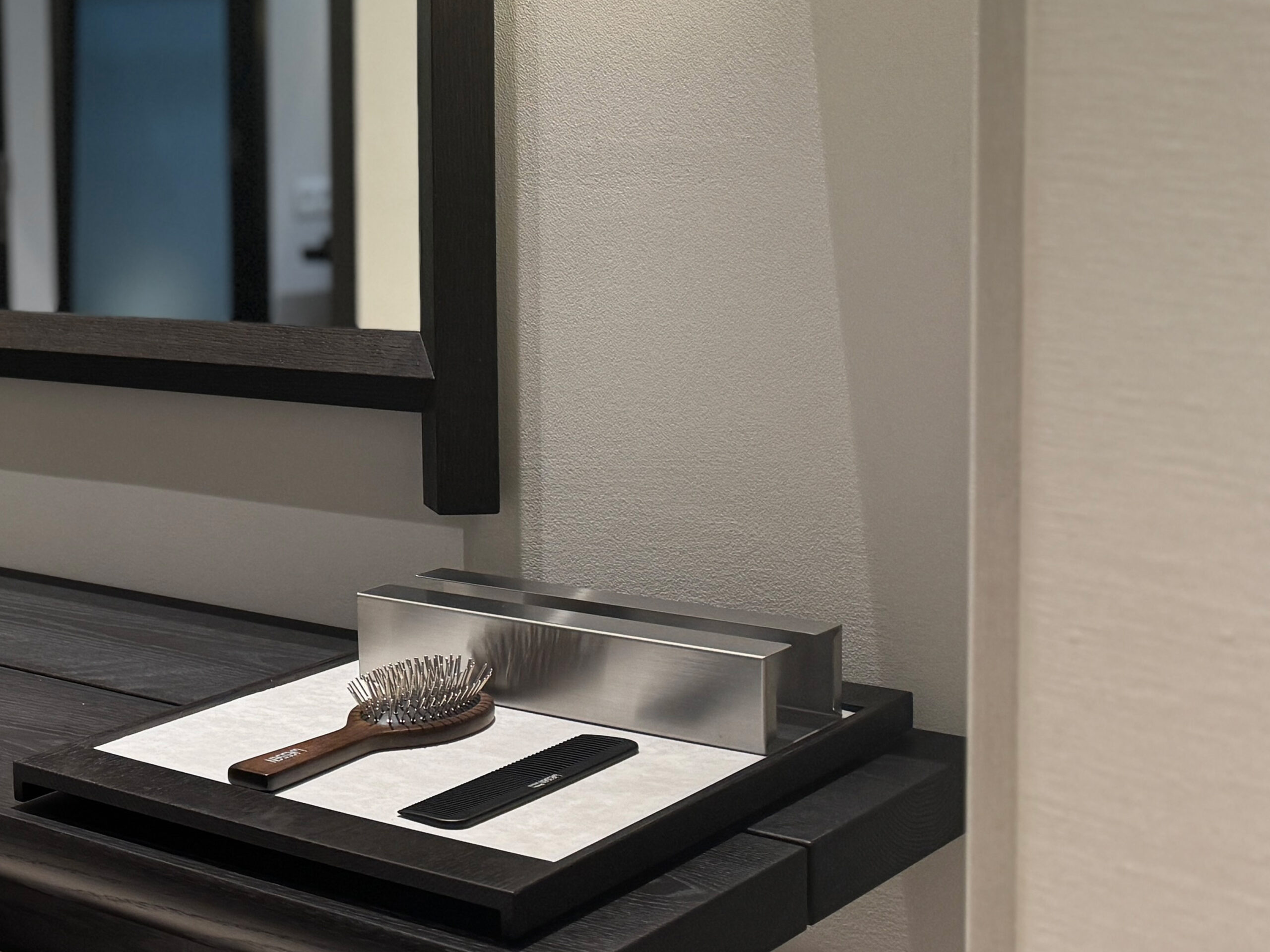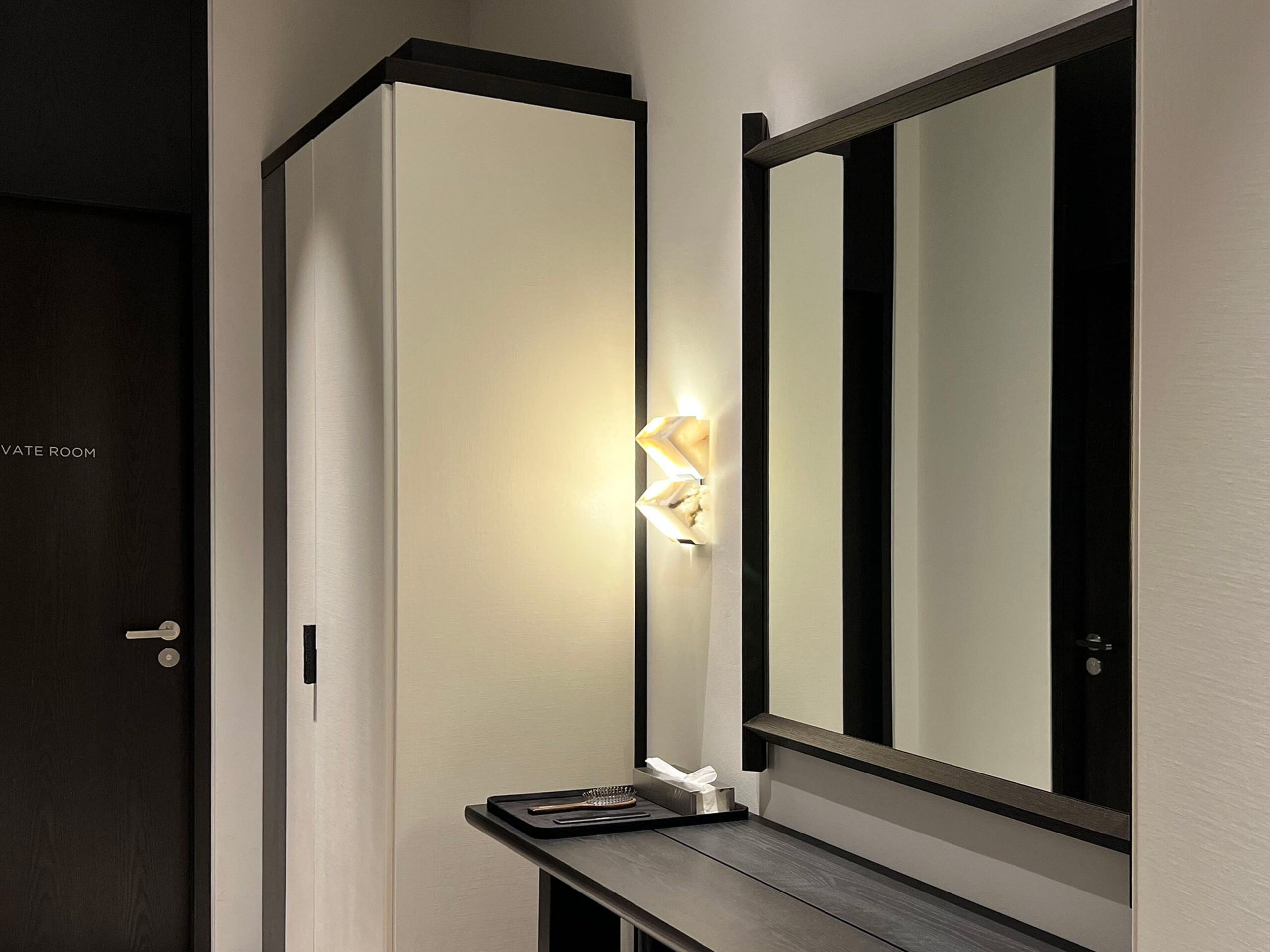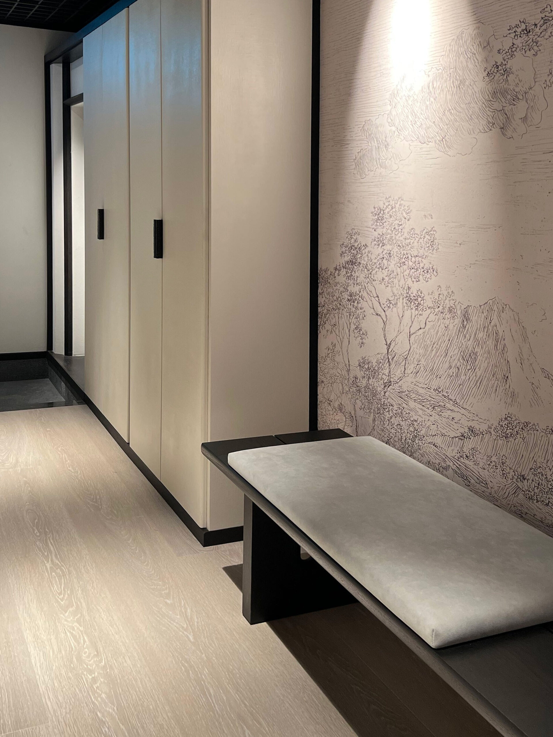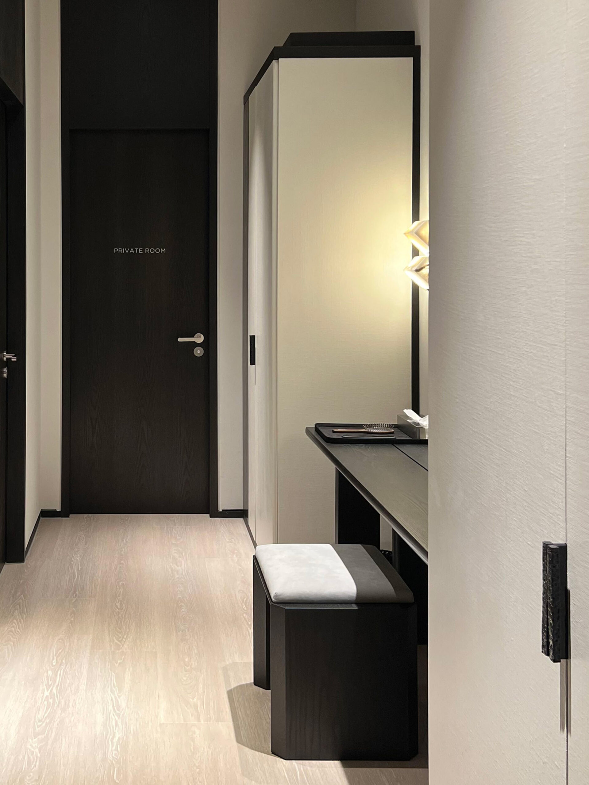 운동 후의 휴식과 리프레시를 위한 프라이빗 공간. 절제되어있는 여백과 동양의 미학이 머무는 공간을 위한 파우더 룸 가구 제작.