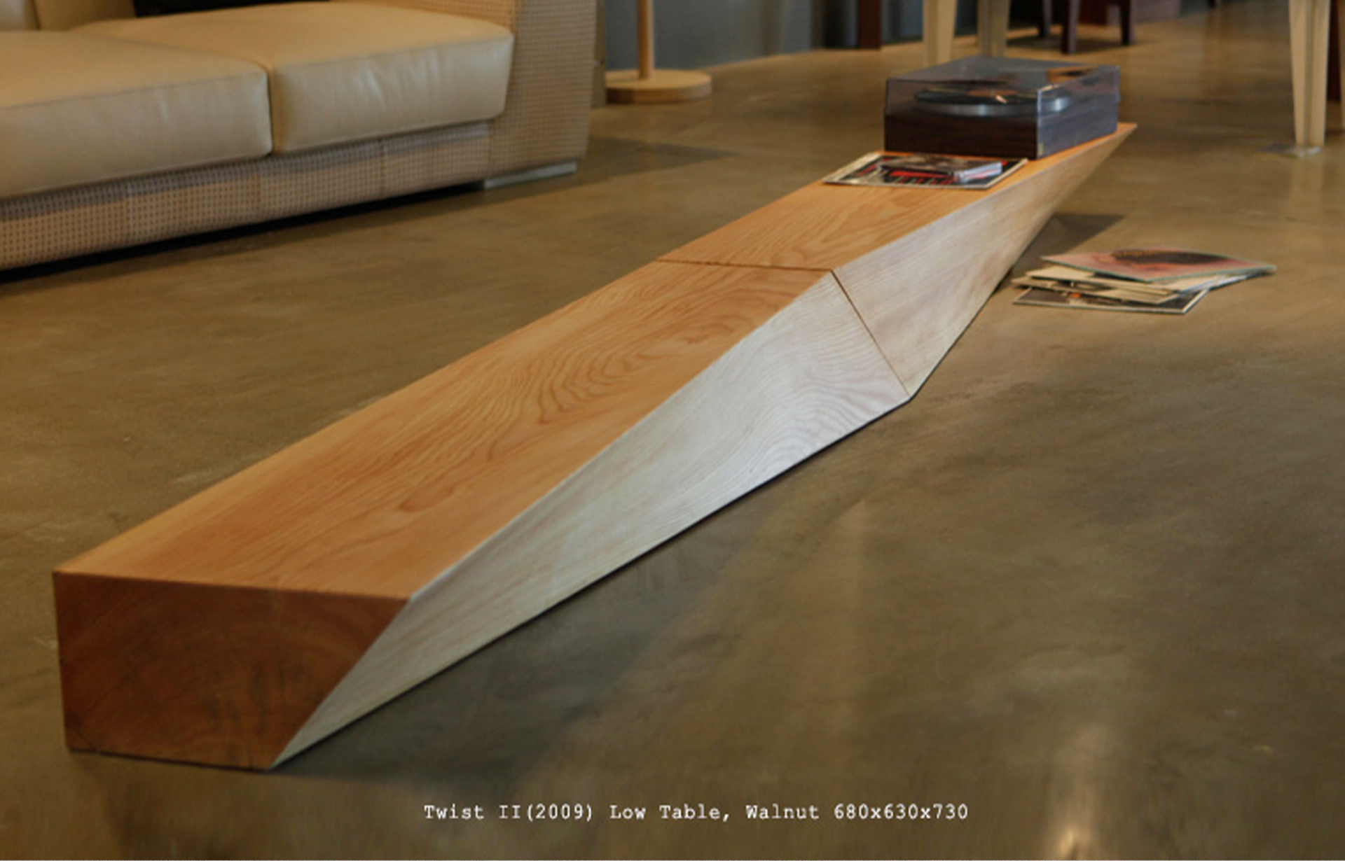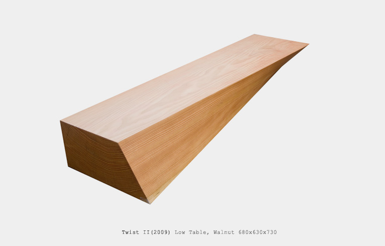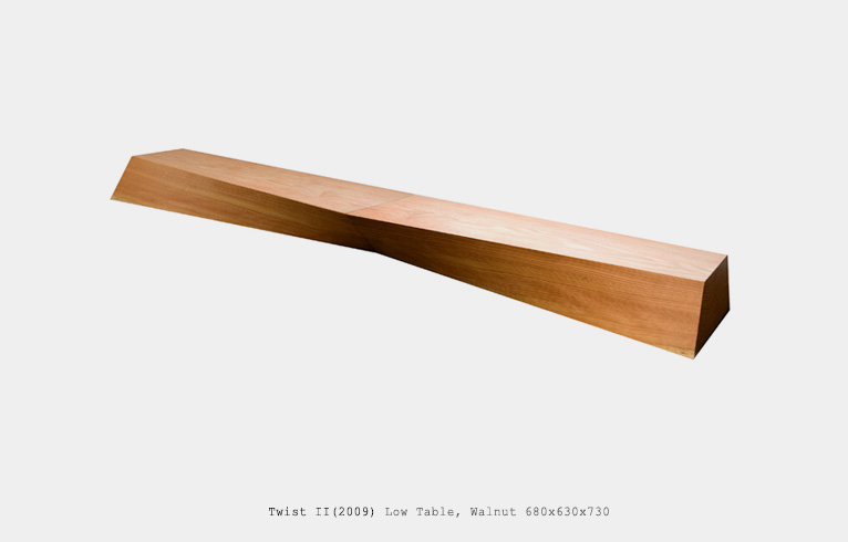 가구디자이너 한정현 작가님의 Twist 시리즈. 정형화되지 않은 비대칭의 각도와 완전한 균형의 실루엣이 돋보이는 작품. 나무 본연의 아름다움과 고체이지만 유기체와 같은 쉐입이 어느 각도에서 보아도 조화롭다.