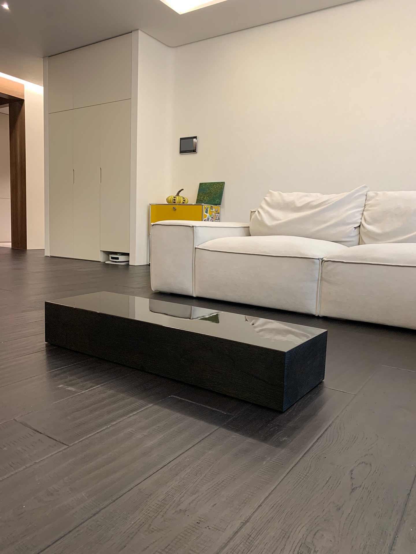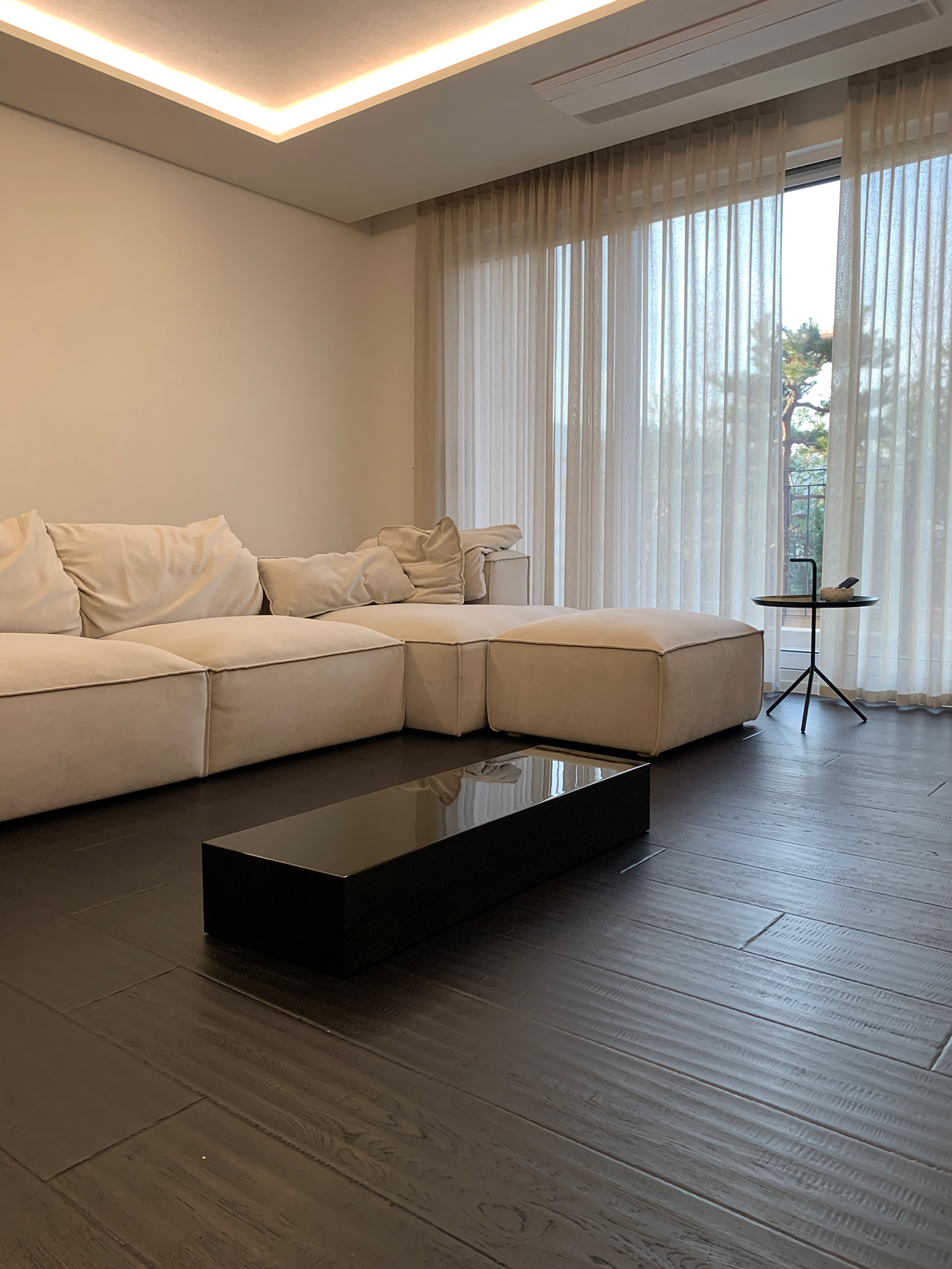 더 블럭 컬렉션 소파 테이블 커스터마이즈. 고동색 마루와 고요한 여백의 공간을 채워주는 동양적인 우드블럭 소파테이블